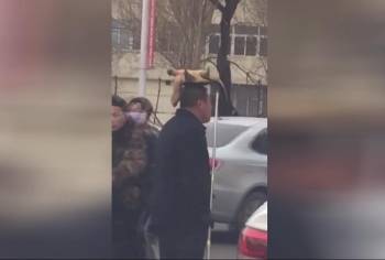 La curiosa imagen de un hombre chino que pasea a su tortuga colocada panza arriba en su ca..
